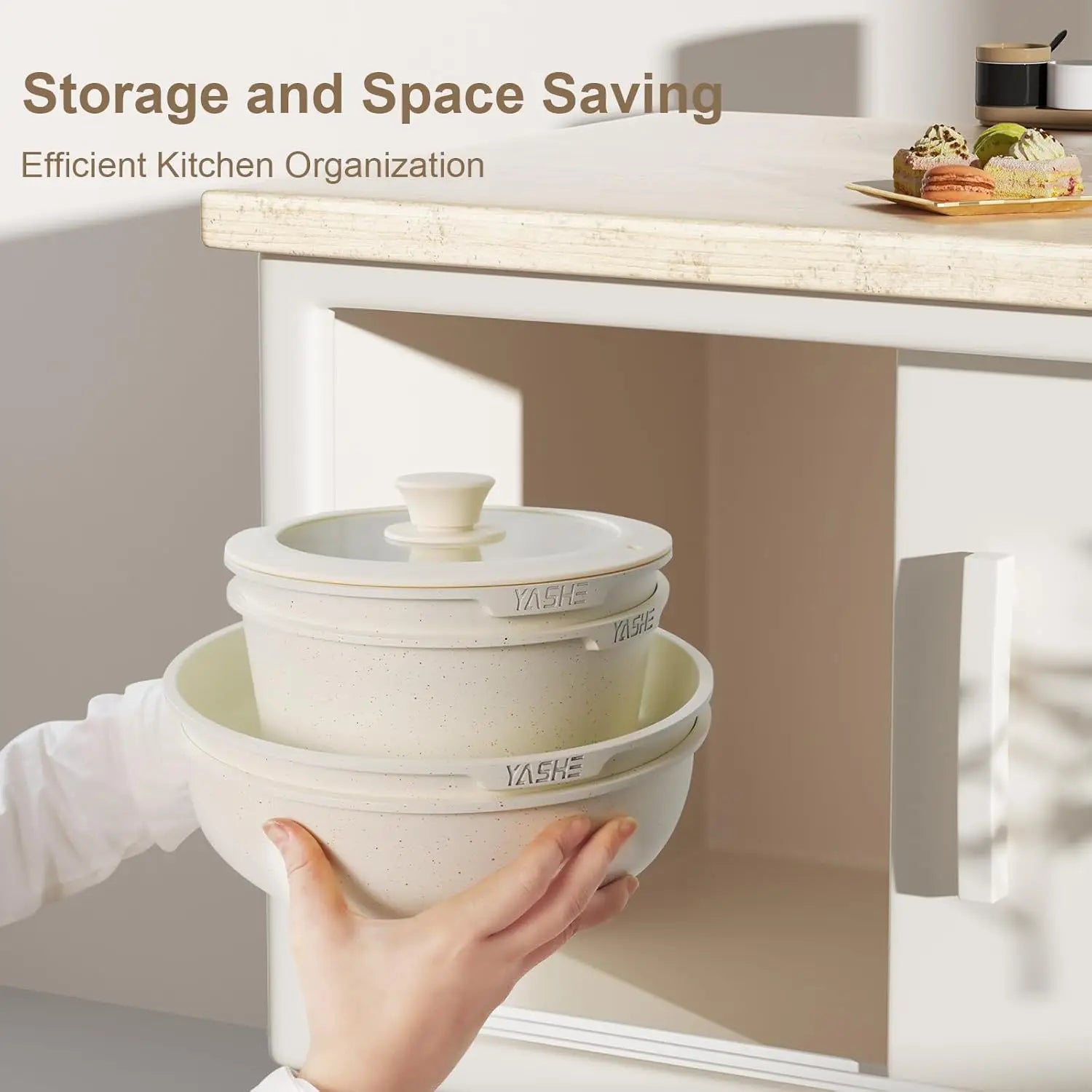- 【Stroage & Saving Space】Each pot is designed to stack or nest, allowing it to be efficiently stored in cabinets or drawers, keeping your kitchen neat and organized at all times. Pan sets non stick also great for camping and RV, saving you valuable space.